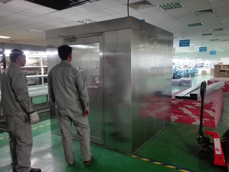 1、自動控制,單人單風淋系統采用PLC智能控制方式,控制面板上的LED閃屏能正確閃爍風淋的工作狀態(tài)、雙門的聯鎖狀態(tài)、風淋循環(huán)的發(fā)展及延時開門。配有光電傳感器,單向通道空氣淋浴房,可從非潔凈區(qū)進入。關門后,紅外傳感器可以感應到人,然后吹淋浴。吹完淋浴后,門鎖上了,只能從門口走出空氣淋浴間。